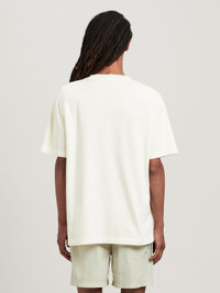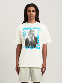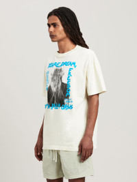 Men's white T-shirt with black and white photo taken from the iconic book “Palm Angels” by Francesco Ragazzi and "Palm Oasis" lettering and message in highlighter blue. Mohamed wears size M Height: 6' 1"" (185 cm) Bust: 34"" (86 cm) Waist: 28"" (71 cm) Hips: 37"" (94 cm) PRODUCT ID: PMAA072S24JER0050340
