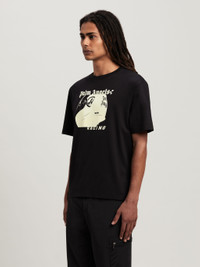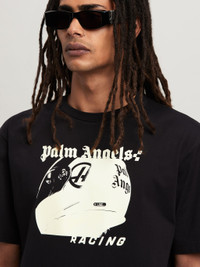Motorsport aesthetics at full ease. Men's black T-shirt with F1 driver's helmet print, Palm Angels logo and Racing lettering printed in white on front. Mohamed wears size M Height: 6' 1"" (185 cm) Bust: 34"" (86 cm) Waist: 28"" (71 cm) Hips: 37"" (94 cm) PRODUCT ID: PMAA089S24JER0041001