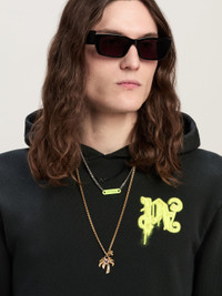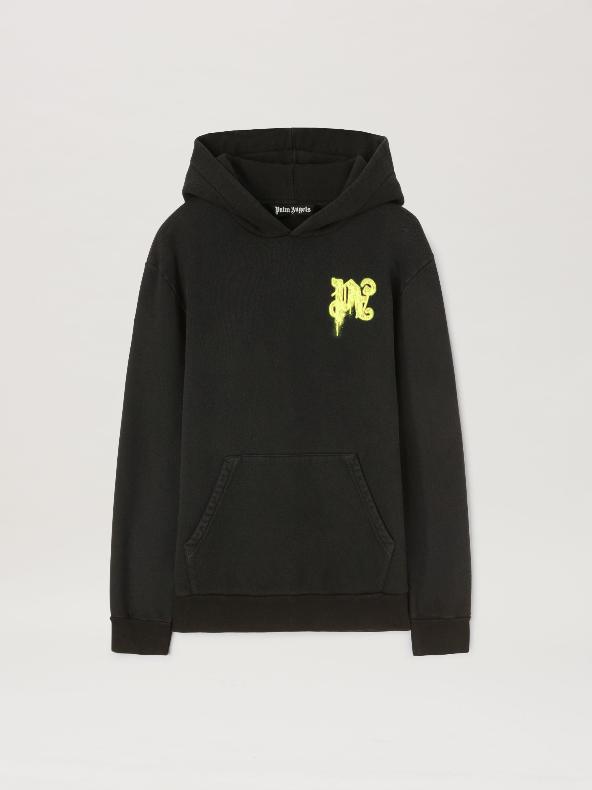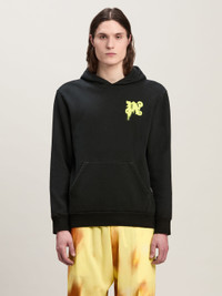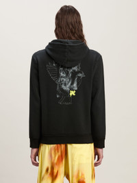 The delicate outline of an illustration with themes from own imaginary sealed by a thick print. Men's black hoodie with pouch pocket and Monogram printed in yellow with sealing wax effect on front, and pencil like portrait of a woman with bird and motto sealed by yellow Monogram on the back. LORENZO WEARS SIZE M HEIGHT: 6' 2" (189 CM) BUST: 36" (92 CM) WAIST: 28" (71 CM) HIPS: 34"" (86 CM) PRODUCT ID: PMBB117F24FLE0011065