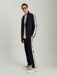 LONG TRACK PANTS IN NAVY BLUE. ELASTICIZED WAISTBAND. TWO-POCKET STYLING AND CENTRAL PINCH SEAMS. WHITE STRIPES AT SIDE LEGS. MODEL HUGO WEARS SIZE M HEIGHT: 6'2 (188 CM) CHEST: 34.5" (87 CM) WAIST: 28" (71 CM) HIPS: 35" (89 CM) PRODUCT ID: PMCA089F21FAB0014637