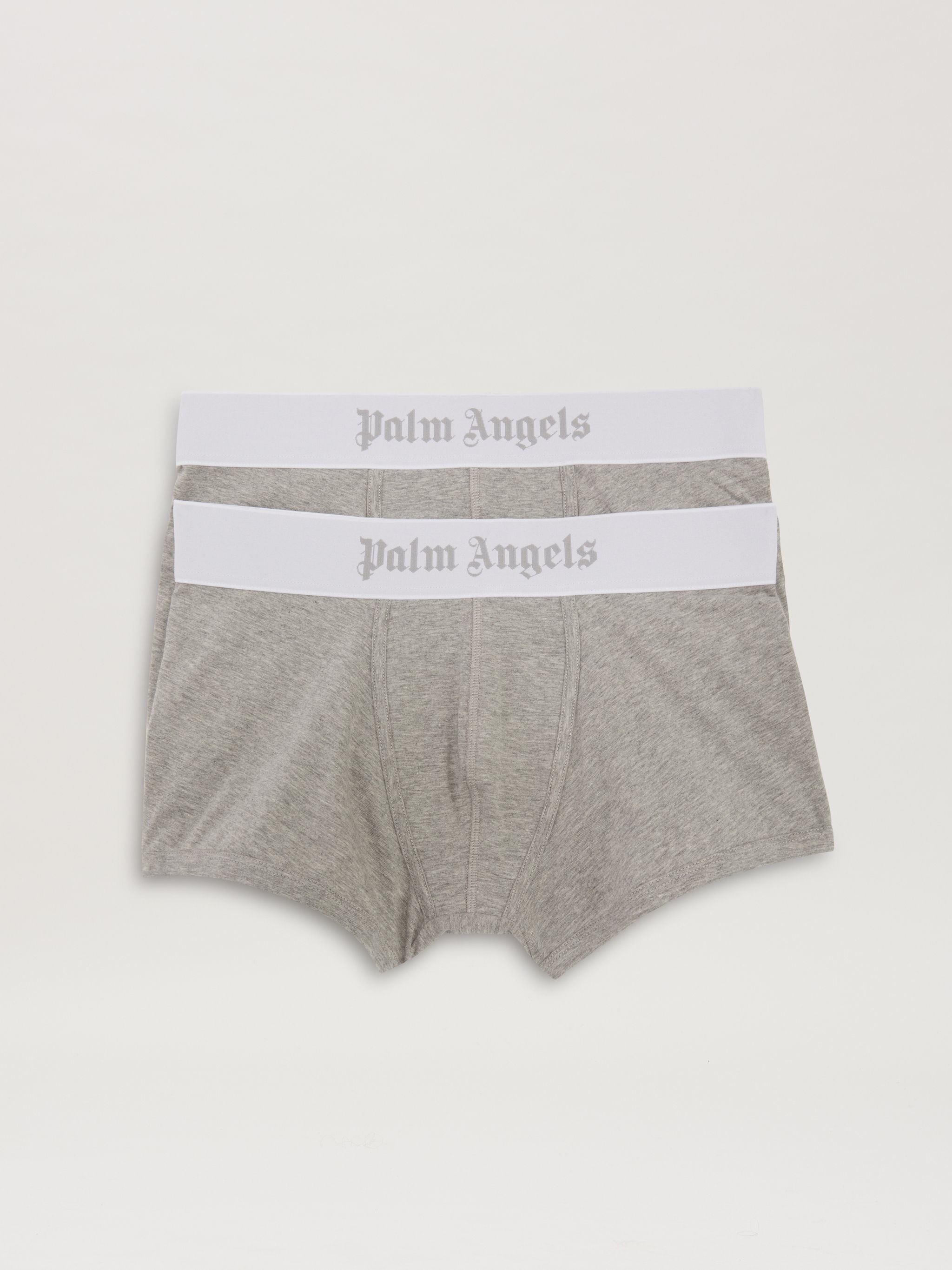 Grey melange underwear trunks in cotton jersey fro men with regular fit, white elastic waistband with grey Palm Angels logo. Two pieces for pack. FABRIC 94% COTTON 6% ELASTANE DETAIL 67% POLYAMIDE 23% POLYESTER 10% ELASTANE PRODUCT ID: PMUH008E23JER0020801