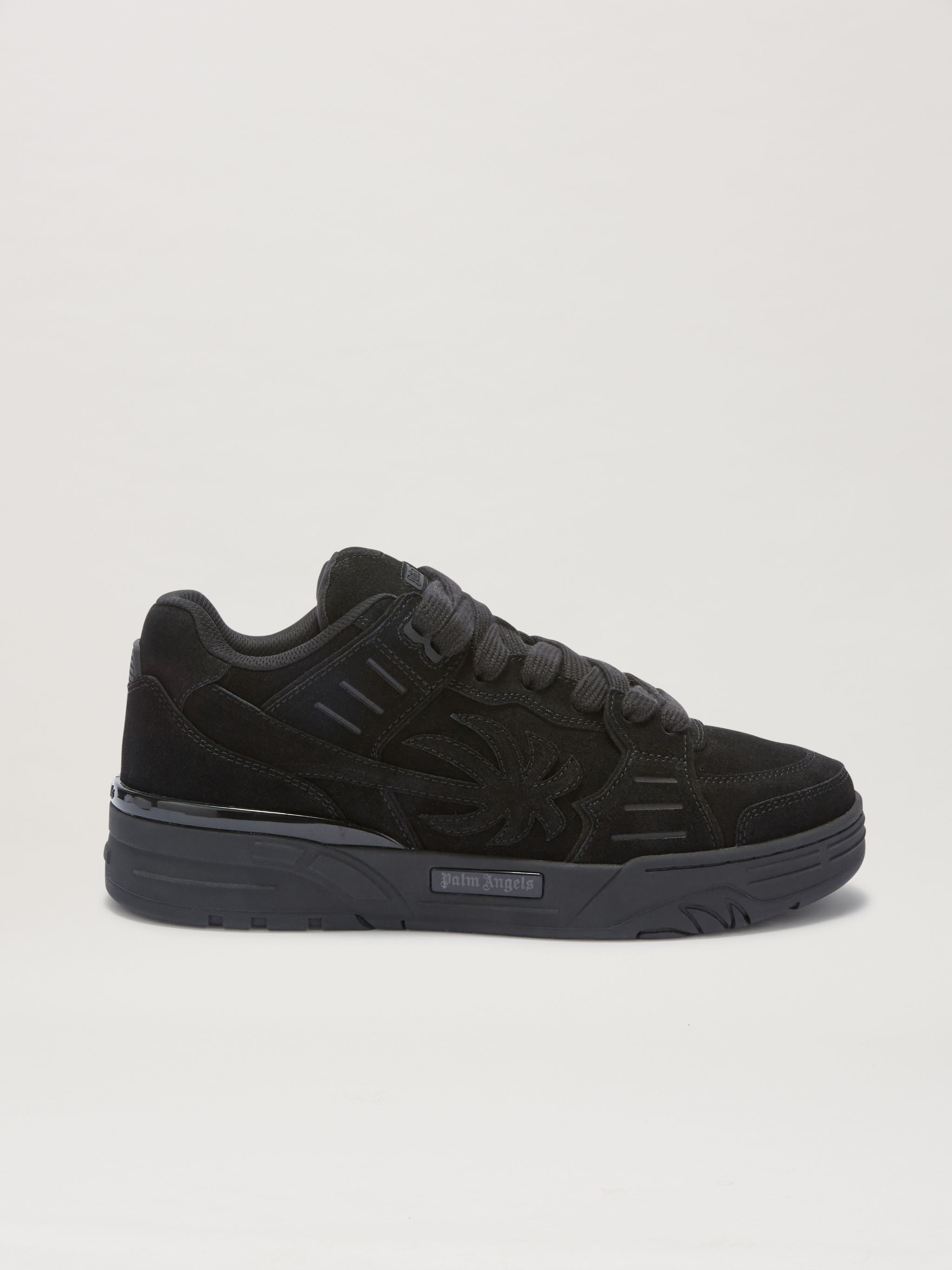 Monochromatic elegance for the most street style of shoes. Black suede sneaker with perforations on the front, elongated palm stitched on the sides and Palm Angels logo on the sole. PRODUCT ID: PMIA101F24LEA0061010