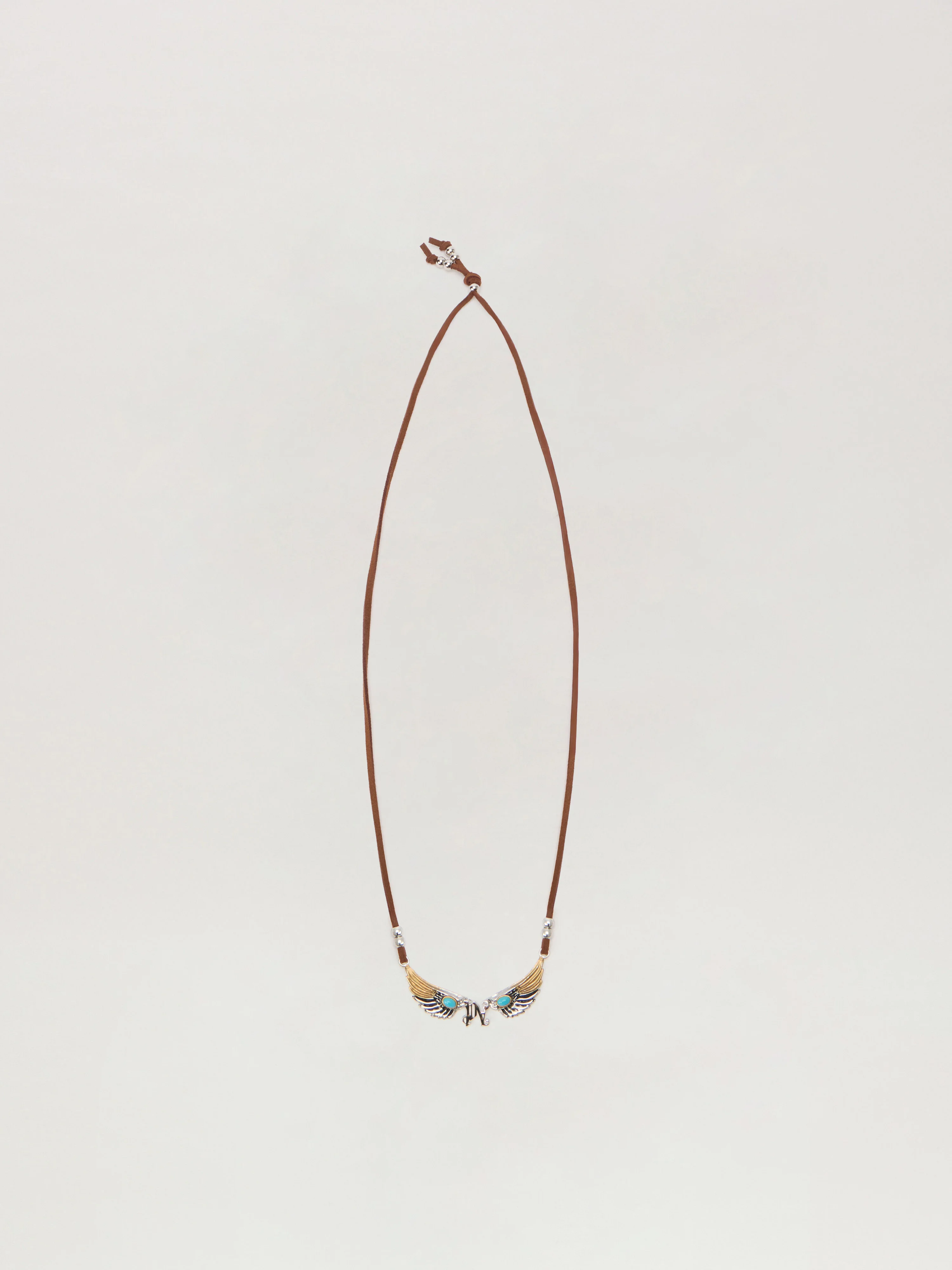 Crafted with precision, this Wings Cord Necklace embodies a harmonious blend of rustic charm and modern flair. Its unique wing detail and turquoise accents exude an effortless cool. - Adjustable cord for versatile styling - Detailed wing motif with turquoise stones - Metallic embellishments for added edge DETAILS - 70% Brass 30% Synthetic leather - Code: PMOB12FF25MAT0017260
