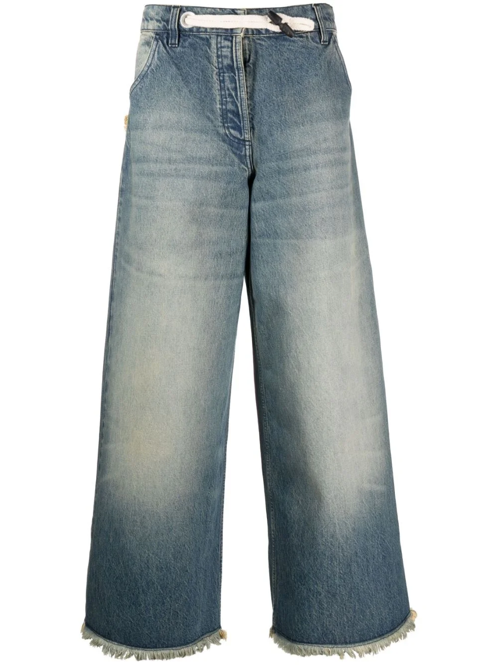x Palm Angels raw-edge jeans These Moncler and Palm Angels jeans are cut to an exaggerated wide-leg silhouette that's secured with a toggle fastening. They're finished with raw edging to the pockets and hem for a street-style finish. Highlights - Blue - Cotton - Denim - Bleach wash - Belt loops - Logo patch to the rear - Toggle fastening - Raw edge - Wide leg - Two side welt pockets - Two rear patch pockets - When buying this unisex item, keep in mind that it is graded in standard men's sizing. Made in Italy Composition Cotton 100% SIZE & FIT Model measurements Height 5 ft 10 in(1.78 m) Bust/Chest 32.67 in(83 cm) Hips 35.43 in(90 cm) Waist 23.22 in(59 cm) FittingInformation Designed with a wide leg cut, these jeans allow for a close fit at the waist and offer a loose and roomy fit over the leg Adjust this piece’s waistband to your preference using the drawstring Sturdy and hard-wearing, this denim piece offers no stretch This piece fits true to size – take your usual size