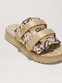 To dress for comfort but in style. Men's slipper with Monogram patterned sole, beige and black comouflage palm bands, Velcro adjustable band, gold buckle and logo. Special Palm Angels x Suicoke Collection. PRODUCT ID: PMIH014F24FAB0026061