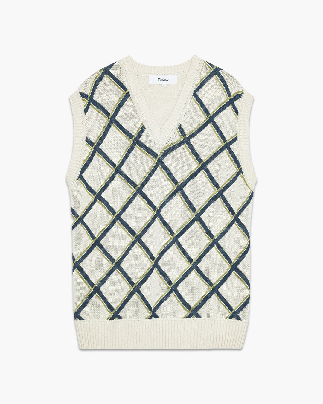 Off white Palmes Argyle Vest made from a blend of 100% cotton and hemp. Displays a green & blue argyle print on the front.