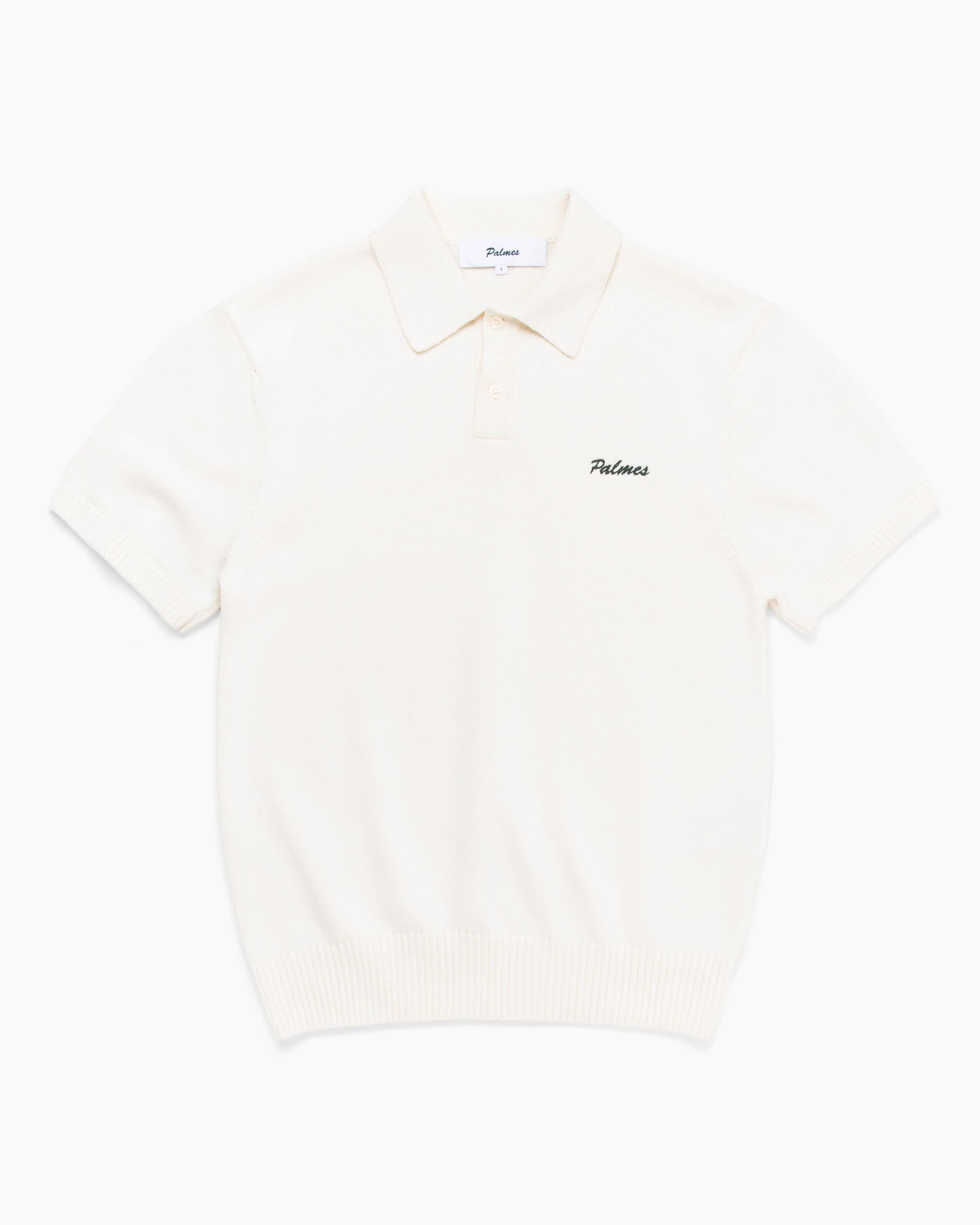 Cotton Knit Polo by Palmes in off white. Crafted from organic cotton with a refined 7-gauge knit, ribbed cuff and hem, and embroidered signature detail. 100% organic cotton