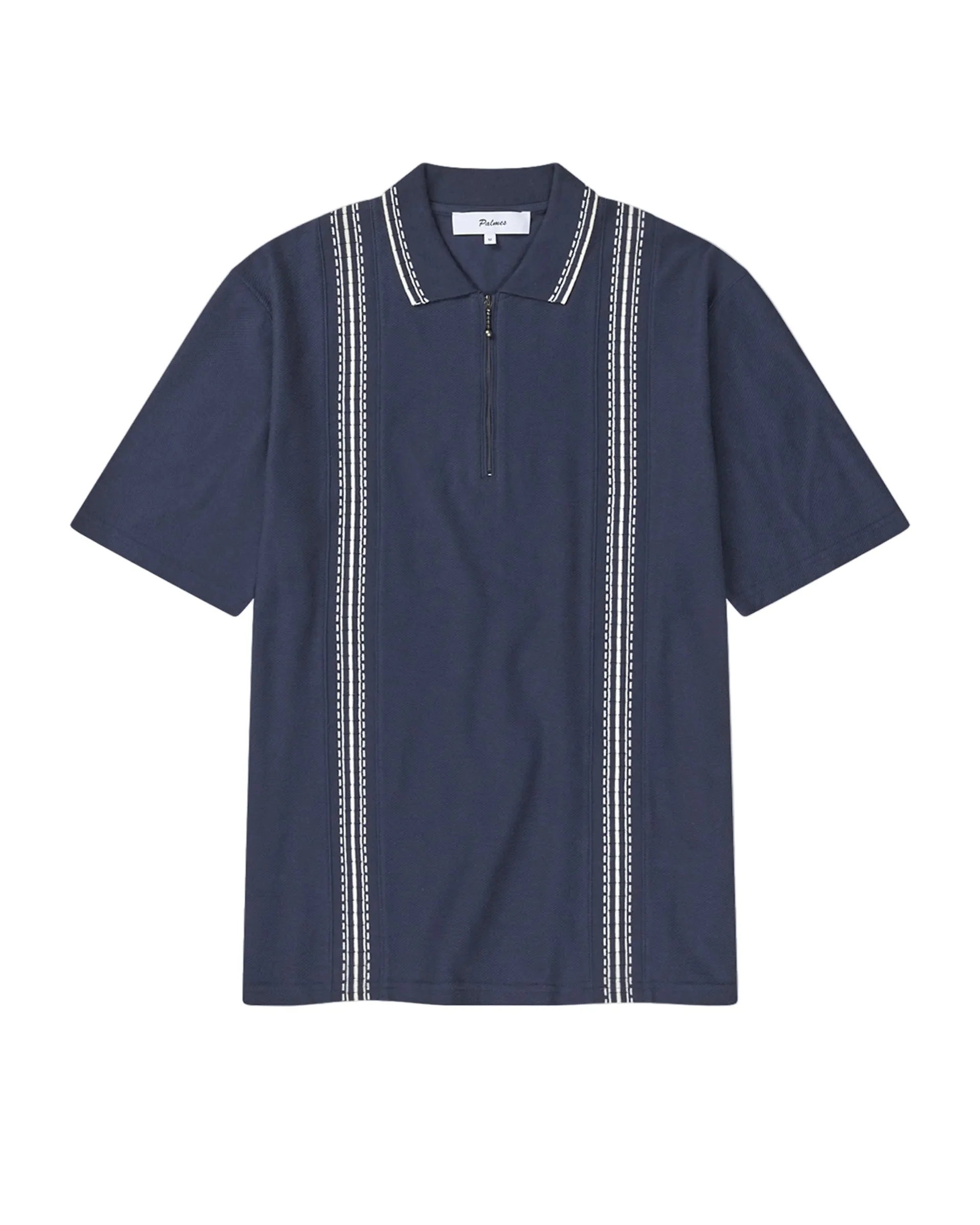 Palmes' Panel Zip Polo combines classic pique construction with knitted rib paneling for a modern silhouette. The navy style features a quarter-zip closure by YKK and custom detailing at the collar. 100% cotton