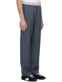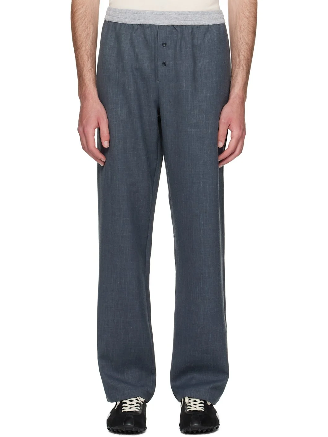 Recycled polyester- and wool-blend hopsack trousers. · Loose-fit · Drawstring at cotton jersey elasticized waistband · Two-pocket styling · Exposed button fly · Mulesing-free wool Supplier color: Grey Body: 55% recycled polyester, 25% wool, 20% linen. Trim: 90% cotton, 10% elastane. Made in Spain 252648M191004