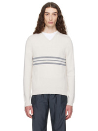 Knit organic cotton sweater. · Rib-knit V-neck, hem, and cuffs · Intarsia reflective stripes at front Supplier color: Off-white Body: 100% organic cotton. Trim: 63% high refraction glass, 20% polyester, 1% polyurethane. Made in Spain 252648M201000