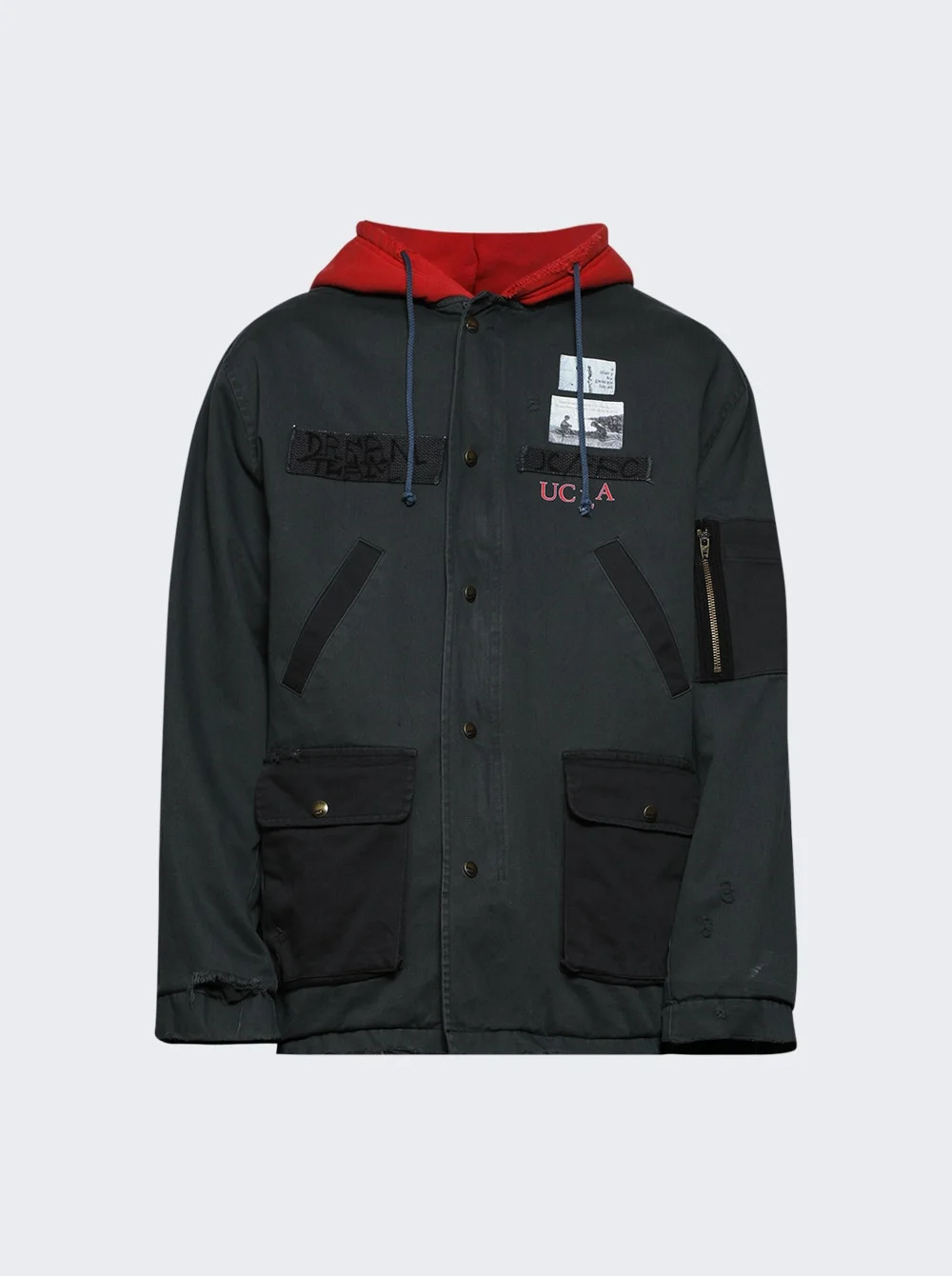 Details - Relaxed-fit updated military field jacket - Heavy vintage wash process with distressed detailing - Leather applique artwork with Tyvek™ patches and front webbing nameplates - Contrast pocket detailing with Riri™ zipper - Custom snap closures - Material: 100% cotton Size Information: Vendor Color Code: Brand Style: 7U003Q3009NVY Designer/Brand: PALY
