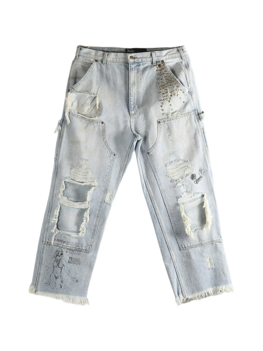 studded ripped trousers Highlights - Denim - Ripped details - Fringed hem - Embellished detail - Graphic print - Multiple pockets Made in United States Composition Cotton 100%