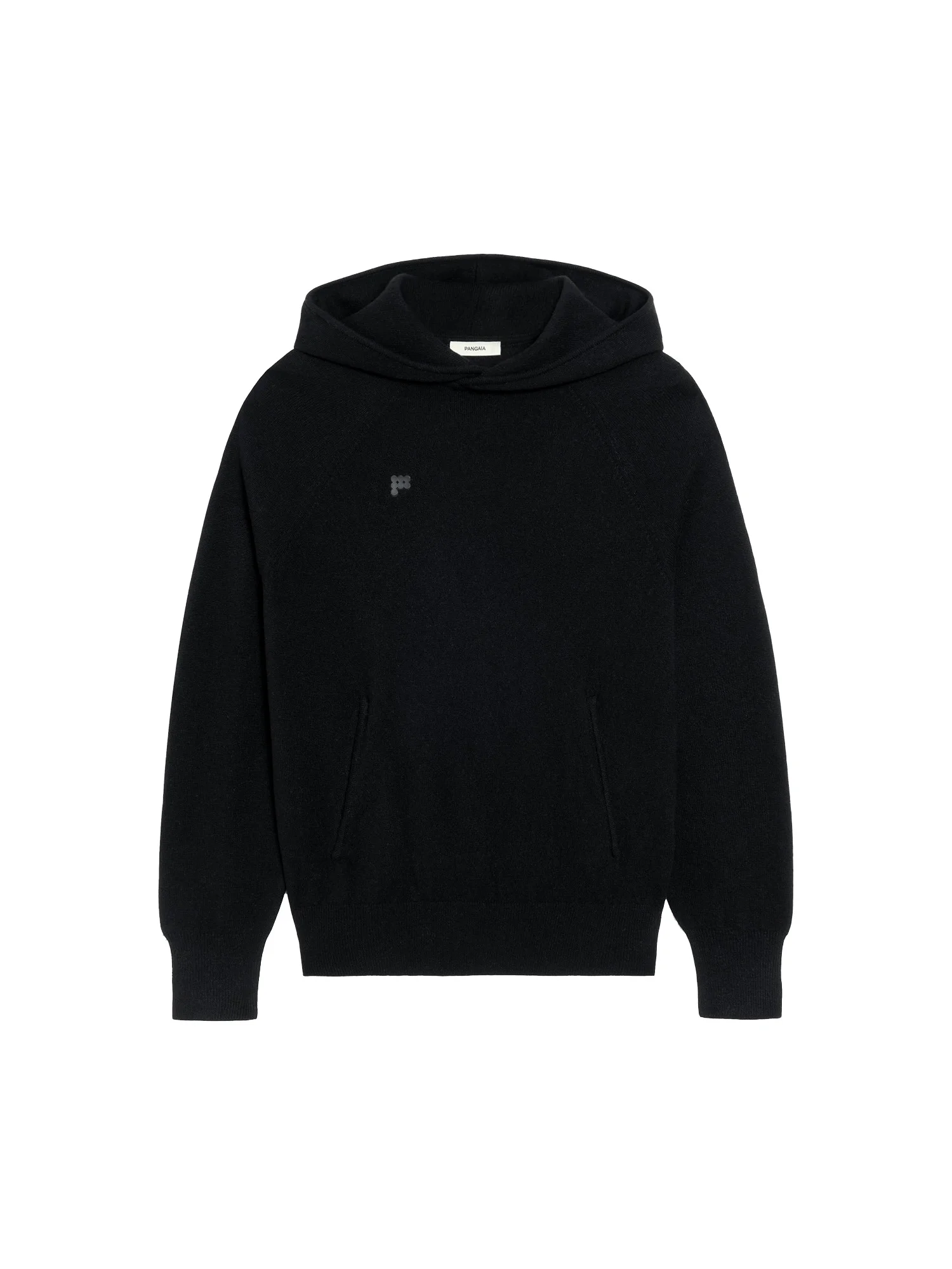 WRAP YOURSELF IN WARMTH WITH THE PANGAIA RECYCLED CASHMERE HOODIE IN BLACK. MADE FROM A BLEND OF 60% RECYCLED CASHMERE, 35% CASHMERE, AND 5% WOOL, THIS HOODIE IS DESIGNED TO GIVE FIBERS A SECOND LIFE, OFFERING A SOFT AND COSY FEEL WHILE REDUCING RELIANCE ON VIRGIN RESOURCES.
