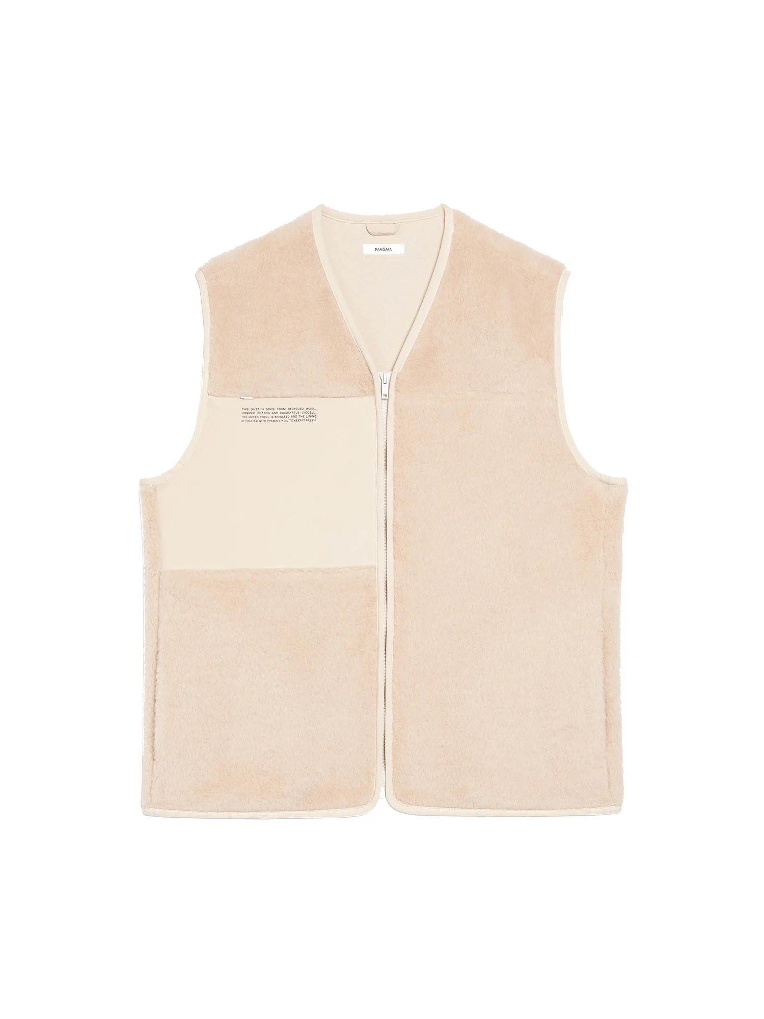 THIS FLEECE GILET IS MADE WITH RECYCLED WOOL AND THE LINING IS MADE FROM ORGANIC COTTON. IT IS TREATED WITH PEPPERMINT OIL (PPRMINT™) TO KEEP IT FRESHER FOR LONGER.