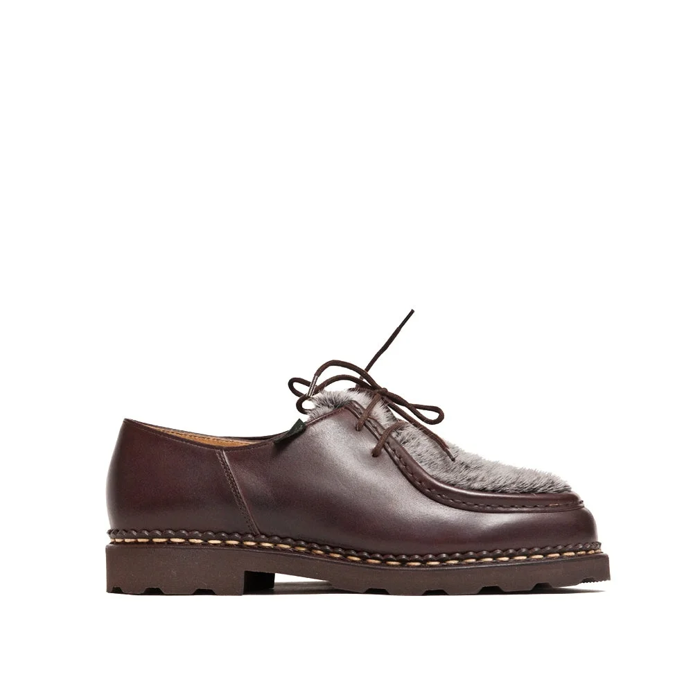 Making some of the finest leather shoes out of France for over 100 years, the Michael from Paraboot stands as a timeless classic appropriate for all walks of life. Coming in a wide range of silhouettes, including a suede and rabbit topped show stopper, these rugged soled kicks are great for longs days on your feet! DETAILS - Calf leather - Rabbit fur - Rubber sole - Norwegian welt - Leather lining - Handmade in France