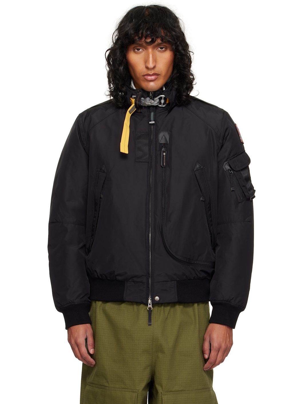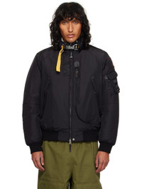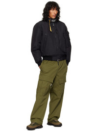 RDS-certified down-filled laminated recycled nylon canvas bomber jacket. Breathable, windproof, and waterproof. · Lobster-clasp at stand collar · Rib-knit stand collar, hem, and cuffs · Two-way zip closure · Zip pockets · Grosgrain trim at shoulders · Utility pocket and detachable logo patch at sleeve · Locker loop at back collar · Detachable webbing tab at back waist · Zip pockets at interior · Full quilted lining Supplier color: Black Fill: 90% duck down, 10% duck feathers. Body: 100% recycled polyamide. Lining: 100% polyamide. Made in China 251048M178011