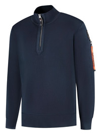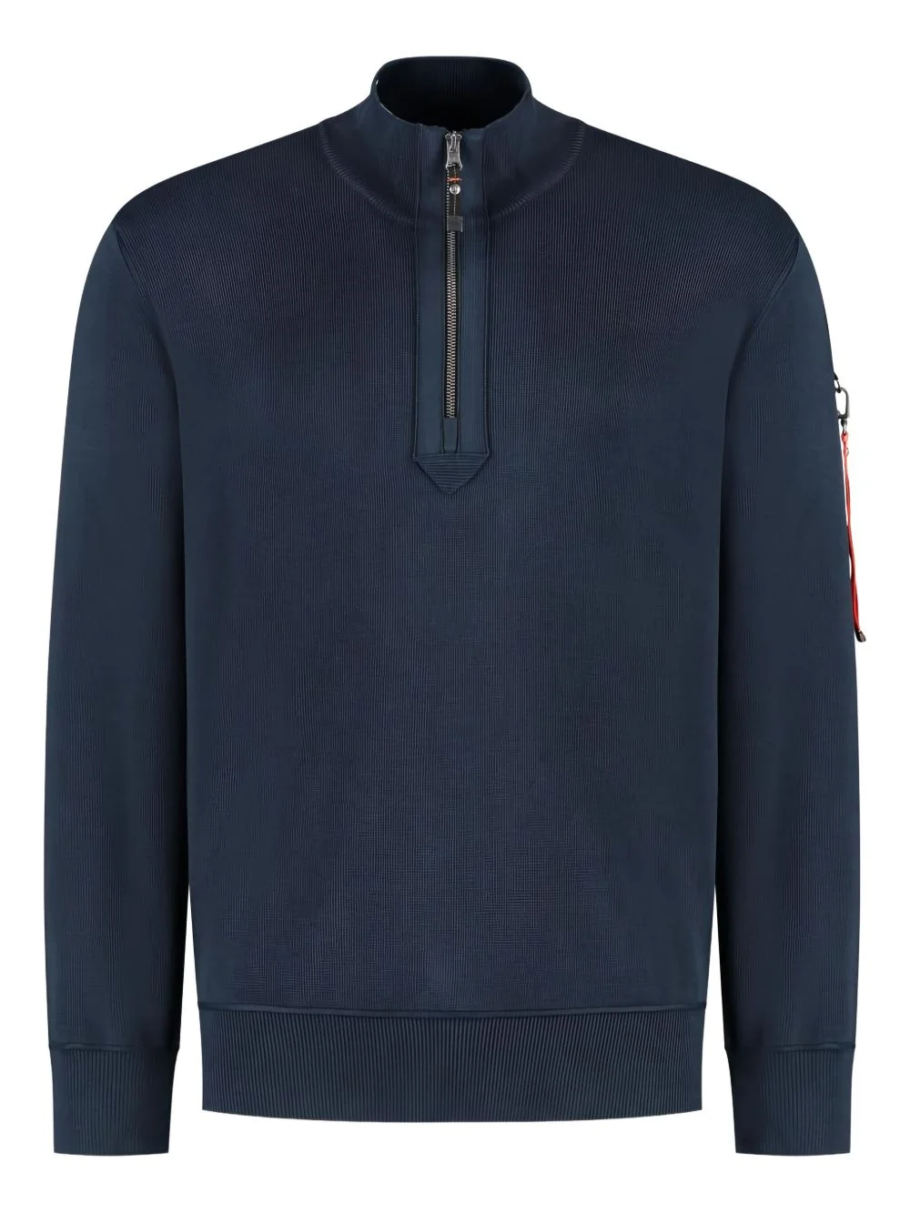half-zip ribbed sweater Highlights - Dark blue - Ribbed texture - Half zip fastening - High neck - Long sleeves - Patch pocket Imported Composition Fabric 100% Washing instructions Read Manufacturer Guidelines