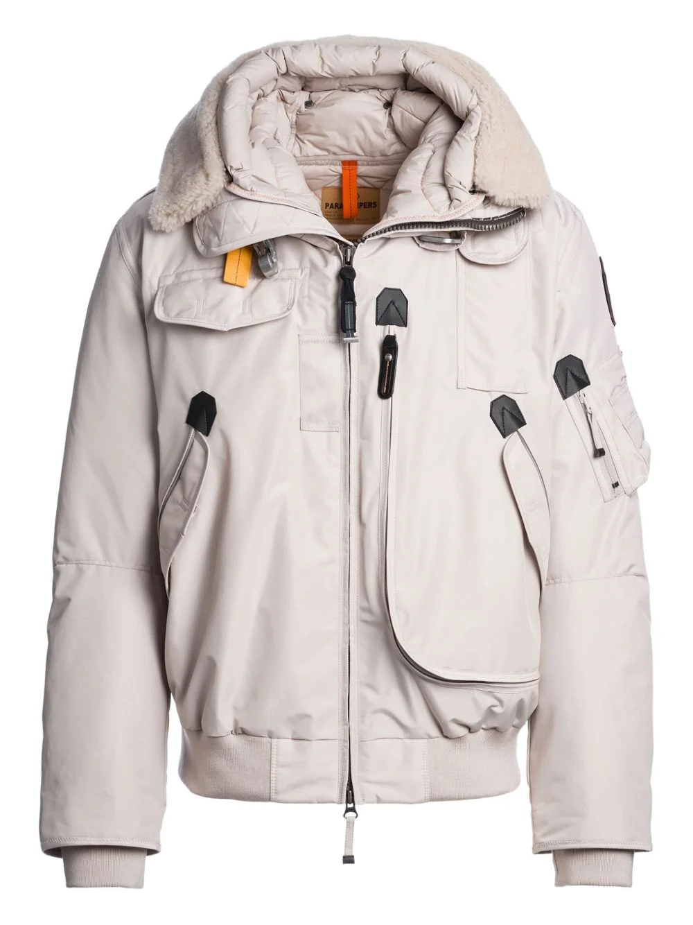 shearling-collar hooded bomber jacket Highlights Imported Composition Lining: Recycled Nylon 100%, Duck Down 90%, Duck Feathers 10% Outer: Recycled Nylon 100%, Lamb Shearling 100%