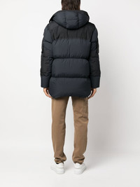 zip-up padded coat navy blue duck feather logo patch at the sleeve padded design classic hood front zip fastening long sleeves Imported Composition Lining: Polyamide 100%, Polyester 100%, Duck Feathers 100% Outer: Polyamide 100% SIZE & FIT Model measurements Height 6 ft 2 in(1.89 m) Bust/Chest 37.79 in(96 cm) Hips 37 in(94 cm) Waist 29.92 in(76 cm) FittingInformation This piece fits true to size. We recommend you get your regular size Cut for a loose fit Made with a mid-weight non-stretch fabric