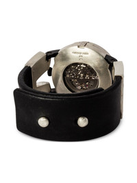 P4—FOB #115 42mm Highlights - Black dial - Black leather strap - Round case - Skeleton dial - Mega pave bezel - Automatic movement - Integrated crown - Stud fastening - This item comes with a standard one-year warranty from the brand. - Normal everyday use and external agents may reduce the lustre of gemstones and gold surfaces. to maintain, use specific, non-abrasive products specially meant for cleaning jewellery. Imported Composition Buffalo Leather 50%, Sterling Silver 40%, Diamond 10% SIZE & FIT Measurement DIAMETER 16.53 in(42 cm) Strap width 11.81 in(300 mm)