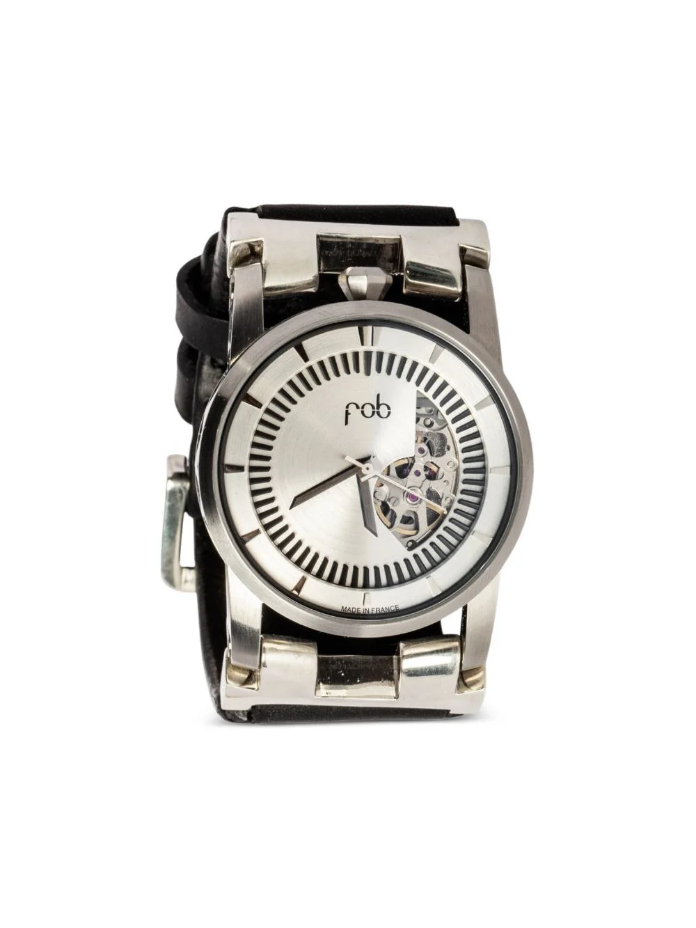 P4—FOB #381 41.3mm Highlights - Silver-tone dial - Black leather strap - Round case shape - Skeleton dial type - Exposed automatic movement - Stainless steel bezel - Pin-buckle fastening - This item comes with a standard one-year warranty from the brand. Made in France SIZE & FIT Measurement DIAMETER 1.62 in(4.1 cm) Strap width 1.29 in(33 mm)