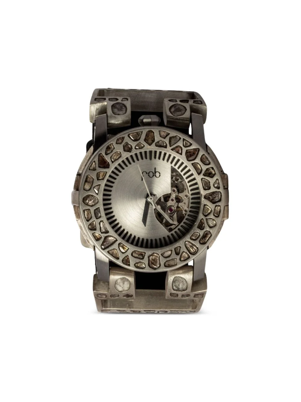 P4—FOB #81 42mm Highlights - Ilver-tone dial - Black leather strap - Round case shape - Open heart dial feature - Mega pave bezel - Automatic movement - Integrated crown - This item comes with a standard one-year warranty from the brand. Imported SIZE & FIT Measurement DIAMETER 1.65 in(4.2 cm) Strap width 1.18 in(30 mm)