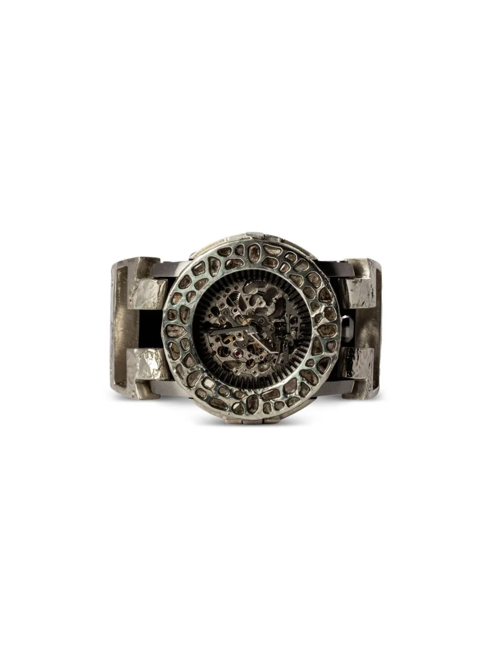 P4—FOB Watch #1638 42mm Highlights - Black - 42mm - Leather strap - Round case - Skeleton dial - Silver dial - Mega pave bezel - Automatic movement - Buckle crown - This item comes with a standard one-year warranty from the boutique. - Normal everyday use and external agents may reduce the lustre of gemstones and gold surfaces. to maintain, use specific, non-abrasive products specially meant for cleaning jewellery. Imported SIZE & FIT Measurement DIAMETER 1.65 in(4.2 cm) Maximum strap length 7.08 in(18 cm)