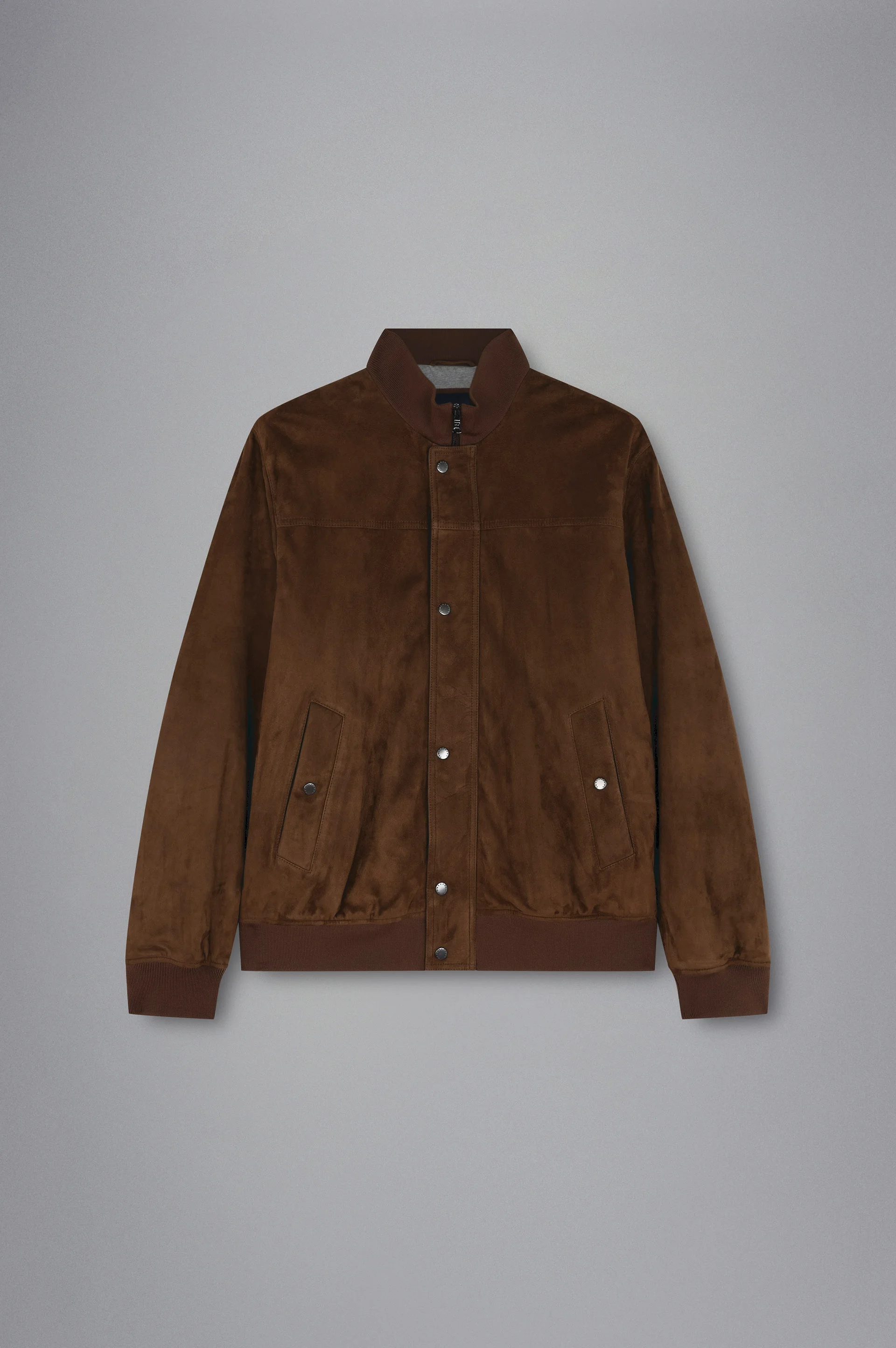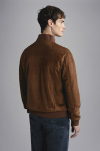 Aqualeather is a special water-repellent suede, treated to combine exceptional softness and comfort with superior functionality. Timelessly elegant, and perfect for casual and smarter occasions alike. This bomber jacket is crafted from Aqualeather: a special kind of suede treated to provide resistance against water and dust. Ribbed trims define its elegant fit, whilst a melange jersey lining ensures an even softer, more luxurious feel. Complete with logo snap buttons and our iconic Fin Badge on the back for a distinctive Paul & Shark touch. DETAILS Two-way zip and press stud closure Aqualeather suede Bomber Ribbed collar, cuffs and flounce Buttoned pockets Multifunctional inner pockets Regular Fit Product ID: 24412485 COMPOSITION & CARE Composition: Outside: goat real leather - Lining: 100% cotton - Sleeves lining: 100% polyester