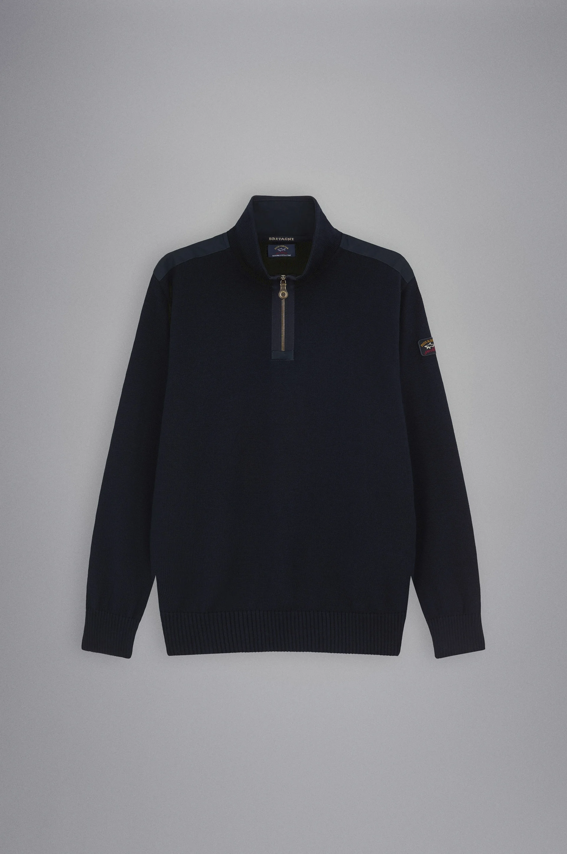 DETAILS High neck with zip Technical fabric inserts Bretagne wool half zip sweater with iconic badge Long sleeves Regular fit Product ID: C0P1033 COMPOSITION & CARE Composition: 100% Wool