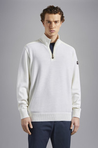 DETAILS High neck with zip Technical fabric inserts Bretagne wool half zip sweater with iconic badge Long sleeves Regular fit Product ID: C0P1033 COMPOSITION & CARE Composition: 100% Wool