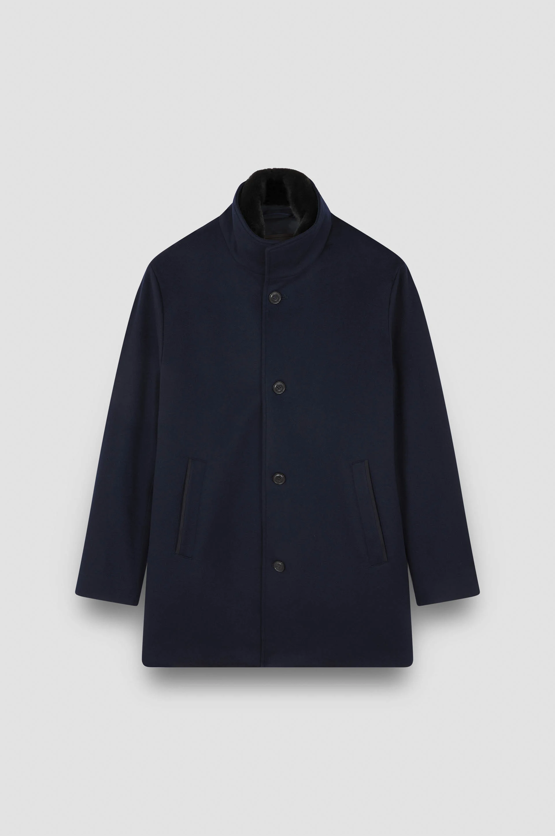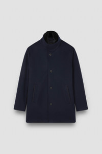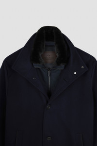 Dedicated to business meetings and formal occasions, this car coat is a timeless essential that no men’s wardrobe is complete without. Its elegant silhouette is enriched with a faux fur collar and detachable padded bib, making it endlessly versatile for all weather conditions. Refined yet practical cashmere fabric sets it apart from the rest, produced in Italy with Loro Piana's Green Storm System®: a Loro Piana registered trademark that makes the fabric waterproof and wind-resistant, without altering the softness or comfort of the natural fibre. DETAILS Metal Shark Fin Collar in eco-fur Button closure Carcoat in cashmere Storm System® Made in Italy by Loro Piana® Welt pockets with tone-on-tone suede trim Small internal pocket Removable padded bib Regular Fit Product ID: 15312418 COMPOSITION & CARE Composition: Outer: 100% cashmere - Lining: 55% polyester, 45% viscose - Padding: 100% polyester - Removable front part: 100% polyester