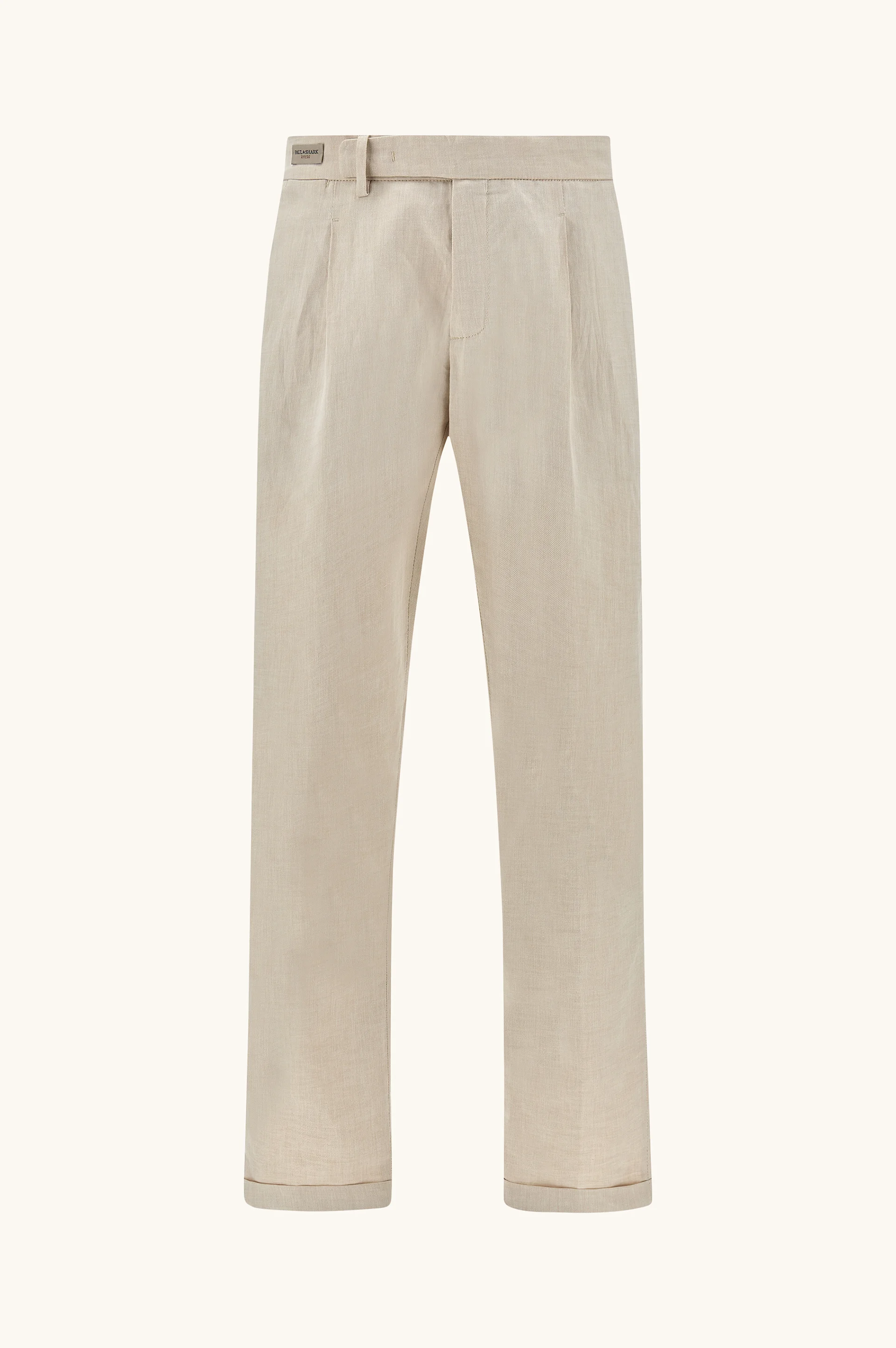 Designed with warm days and summer nights in mind, these Riviera Collection chino trousers reinterpret leisure with sartorial precision. The linen and cotton fabric balances freshness and structure, ensuring a clean, refined appearance. The front pleat shapes the silhouette, finished with elegant turned-up hems. Contrast linen internal details and the iconic Shark label on the back pocket add a distinctive Paul & Shark signature. DETAILS Shark label Three-button and zip closure Chino trousers in linen and cotton with pleats Welt pockets Pressed pleat Regular Fit The model is 189 cm tall and wears size 50 Product ID: 26414083 COMPOSITION & CARE Composition: 60% linen 40% cotton - Pocket lining: 100% cotton