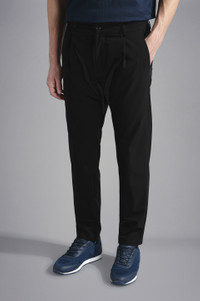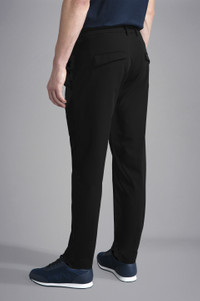 DETAILS Zip and button closure Garment dyed Dynamic Stretch technical fabric trousers Inserto elastico inserito nel punto vita. Back pockets with button and flap, front French pockets and invisible zipped pocket on left side Regular Fit Product ID: 24414071 COMPOSITION & CARE Composition: Outside: 84% Nylon 16% Elastane- Pocket lining: 100% Polyester