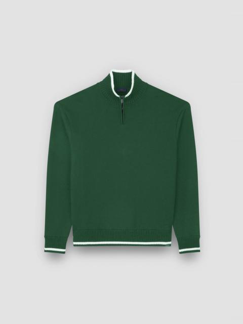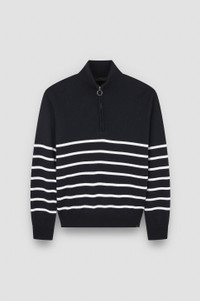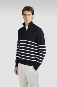 Discover Soft Cool Touch: an innovative finish that results in a fabric that's water-repellent, compact and flexible. The colours of the ocean collide with Paul & Shark’s ionic style codes in a creative blend that oozes quiet luxury. This jumper with intarsia Breton stripes is knitted from wool and treated with Soft Cool Touch technology: the yarn is cold-pressed to create a super-compact yet flexible texture that’s resistant to pilling and makes water slide right off the surface. Perfect thrown over a T-shirt or shirt, it features a half-zip closure and ribbed trims for a clean, well-defined silhouette. DETAILS Shark label Zip closure Soft Cool Touch wool half-zip sweater fineness 8 Ribbed collar, cuffs and flounce Stocking stitch Long sleeve Regular Fit Product ID: 15311142 COMPOSITION & CARE Composition: Outer: 50% Virgin Wool 50% Acrylic