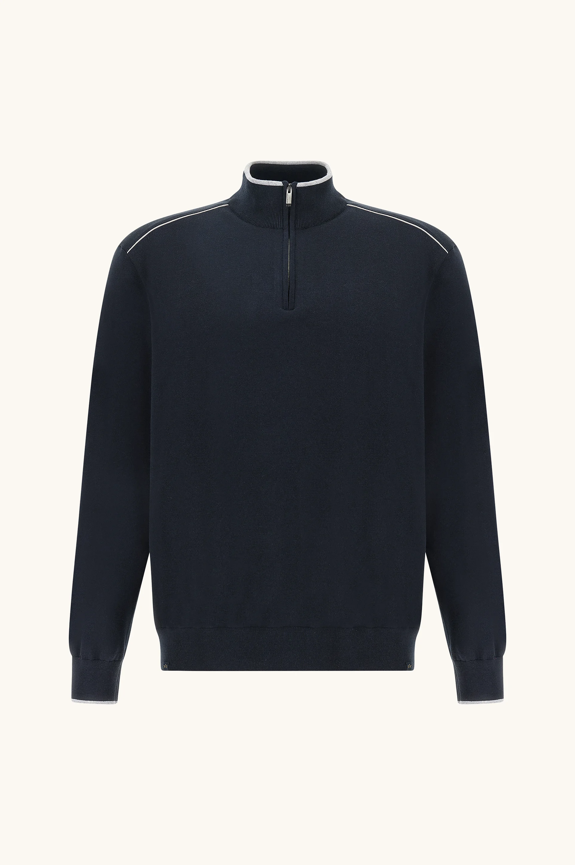 HALF‑ZIP SWEATER IN COTTON AND SILK WITH AQUALEATHER SUEDE DETAILS
