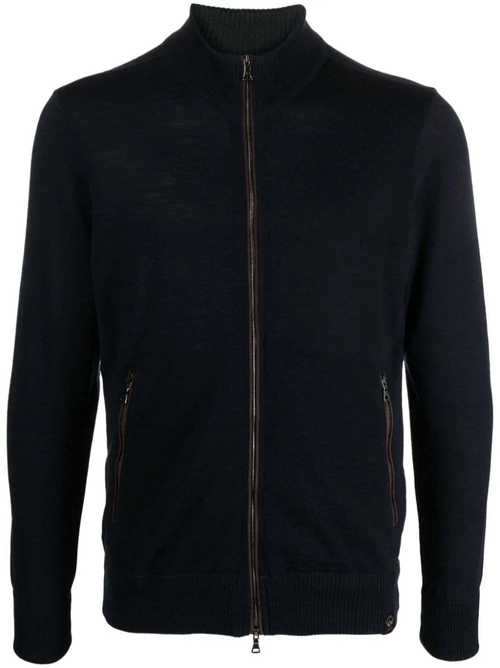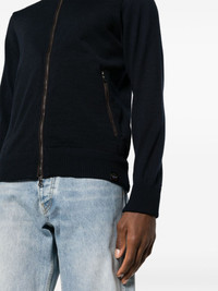 high-neck virgin wool cardigan Highlights - Midnight blue - Virgin wool - Knitted construction - High neck - Two-way zip fastening - Long sleeves - Front two-way zip fastening - Ribbed cuffs and hem Imported Composition Virgin Wool 100% SIZE & FIT Model measurements Height 6 ft 0 in(1.84 m) Bust/Chest 36.22 in(92 cm) Hips 35.43 in(90 cm) Waist 26.77 in(68 cm) FittingInformation Designed for a slim fit, offering a comfortable fit that sits just away from the body The ribbed hem offers a close, comfortable fit Made with a midweight knit, this piece offers some stretch This piece fits true to size – take your usual size Washing instructions Machine Wash