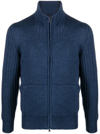high-neck zip-up cardigan navy blue virgin wool ribbed detailing high neck front zip fastening long sleeves two front pouch pockets straight hem Imported Composition Virgin Wool 100% SIZE & FIT Model measurements Height 6 ft 1 in(1.85 m) Bust/Chest 31.88 in(81 cm) Hips 33.07 in(84 cm) Waist 26.77 in(68 cm) FittingInformation This piece fits true to size. We recommend you get your regular size Cut for a slim fit Made with a mid-weight fabric Washing instructions Machine Wash