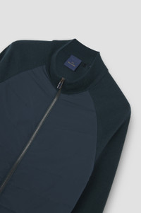 Reserved for our most refined pieces, Typhoon Platinum combines watertightness, breathability and wind resistance with an ultra-luxurious texture. Form meets function to create a hybrid style that unites refined lines with innovative materials. This cardigan is knitted from wool and treated with Soft Cool Touch technology: the yarn is cold-pressed to create a super-compact yet flexible texture that’s resistant to pilling and makes water slide right off the surface. The front stands out in our iconic Typhoon Platinum, a high-performance fabric with an ultra-luxurious tactile feel. Lightweight quilting and a two-way zip closure make it a refined yet essential addition to your transitional rotation. DETAILS Shark label Two-way zip closure Channel quilting Hybrid cardigan in Soft Cool Touch wool fineness 18 with padded torso in Typhoon® Platinum with quilting Ribbed collar, cuffs and flounce Piped side pockets. Raglan long sleeve Regular Fit Product ID: 15311269 COMPOSITION & CARE Outer: 94% virgin wool, 6% polyester - Front: 100% polyester - Padding: 100% polyester - Lining: 100% polyester