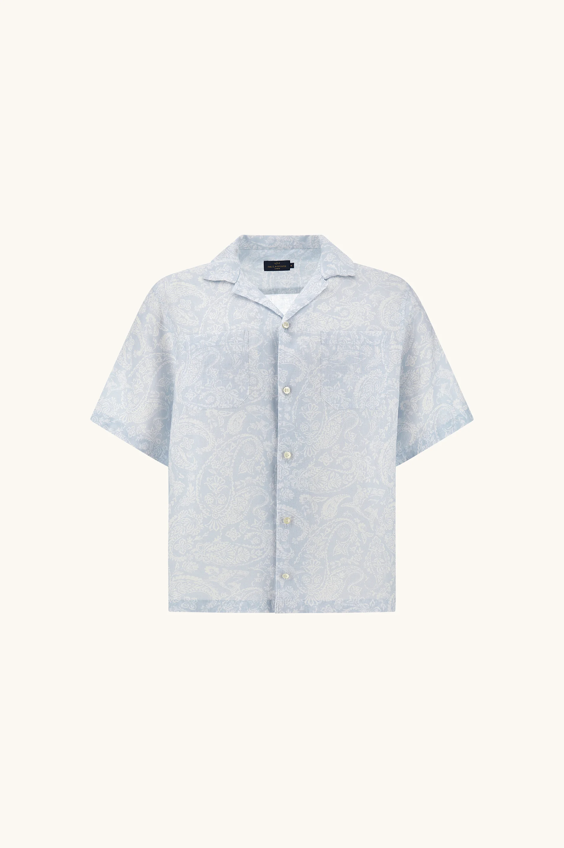 Freedom, creative spirit and Mediterranean influences define this short-sleeve paisley shirt, designed to experience summer without boundaries. Inspired by the bohemian aesthetic of the 1960s, the graphic pattern adds character while maintaining an elegant balance. Soffio linen ensures natural lightness and a pleasant softness against the skin, even in the height of summer. Ideal for sailing trips, at the beach or at open-air concerts and festivals, its boxy fit wears effortlessly with lightweight trousers or shorts, becoming a spontaneous expression of personal style. DETAILS Shark label Button closure Linen shirt with Shark Paisley pattern Chest pocket Short sleeve Boxy fit The model is 189 cm tall and wears size L Product ID: 26413177 COMPOSITION & CARE Composition: 100% linen