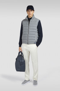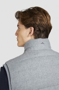 Wool Cashmere, a fine fabric that combines the softness of cashmere with the strength of wool, ideal for elegant and comfortable garments. This vest elevates an understated silhouette with exclusive materials and sartorial details. Its wool-cashmere melange fabric shell is insulated with Re-Goose Down padding, boasting a fill power of 650 whilst giving a new life to recycled goose and duck down. Re-Goose Down uses less water and energy than traditional fibres, and is made without the use of harmful chemicals. Rib-knit trims ensure a well-defined fit, while suede details bring out its elegant allure. The inside reveals a sophisticated satin lining and a handy zip pocket for small essentials. DETAILS Metal Shark Fin Two-way zip closure Channel quilting Padded gilet in wool and cashmere with ribbed knit edges Side pockets with zip and suede trim Internal pocket with zip Satin lining Regular Fit Product ID: 15312380 COMPOSITION & CARE Composition: Outer: 80% virgin wool, 20% cashmere - Lining: 51% polyester, 49% acetate - Interlining: 100% polyester - Padding: 70% down, 30% feathers