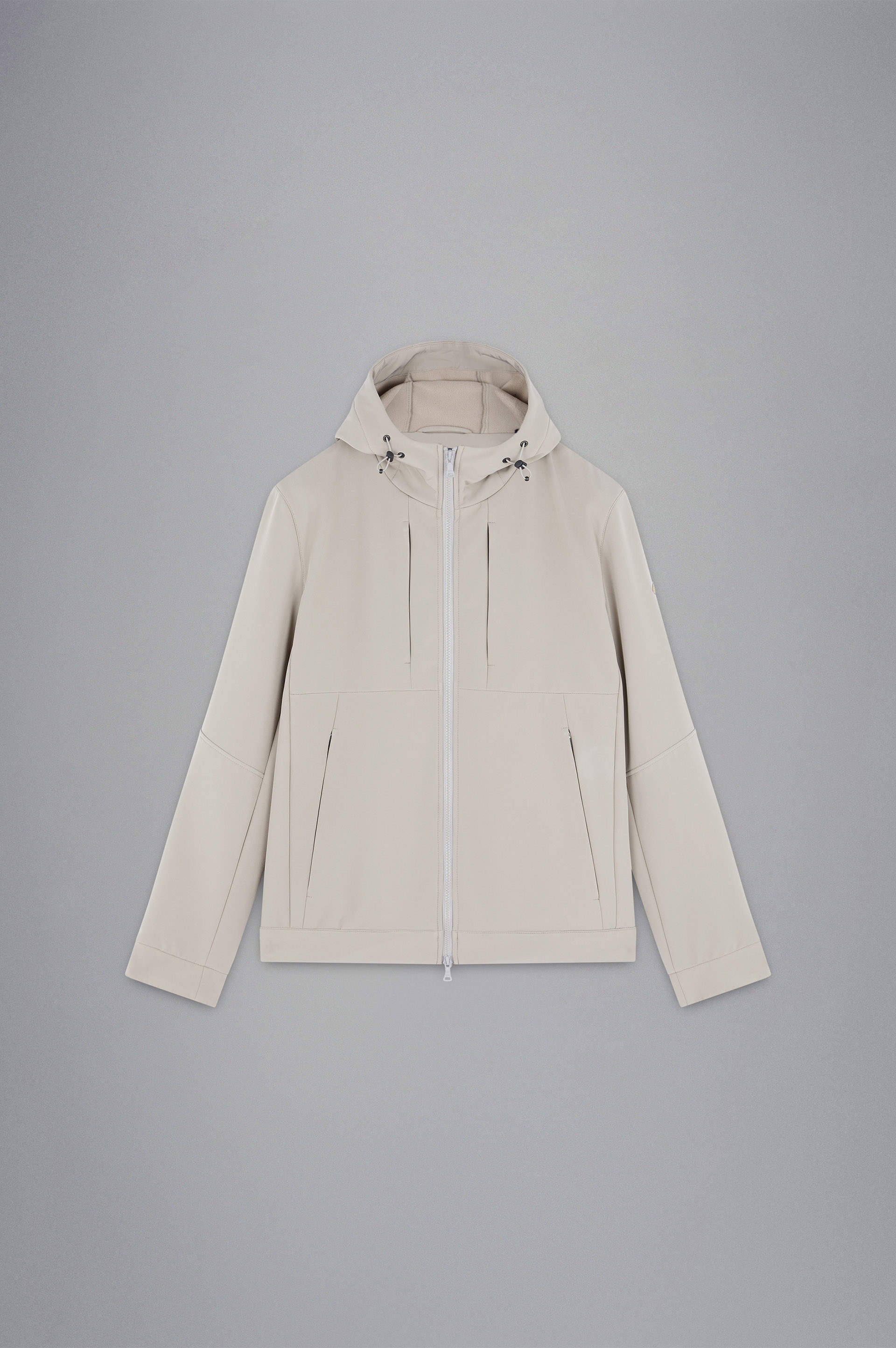 DETAILS Moon badge Hood Zip closure Fleece lining Re-Shark shell Jacket Adjustable bottom with drawstring Zipped pockets Inside pocket with snap button Product ID: 14312100 COMPOSITION & CARE Composition: Outer: 88% Polyester 12% Elastane - Lining: 100% Polyester