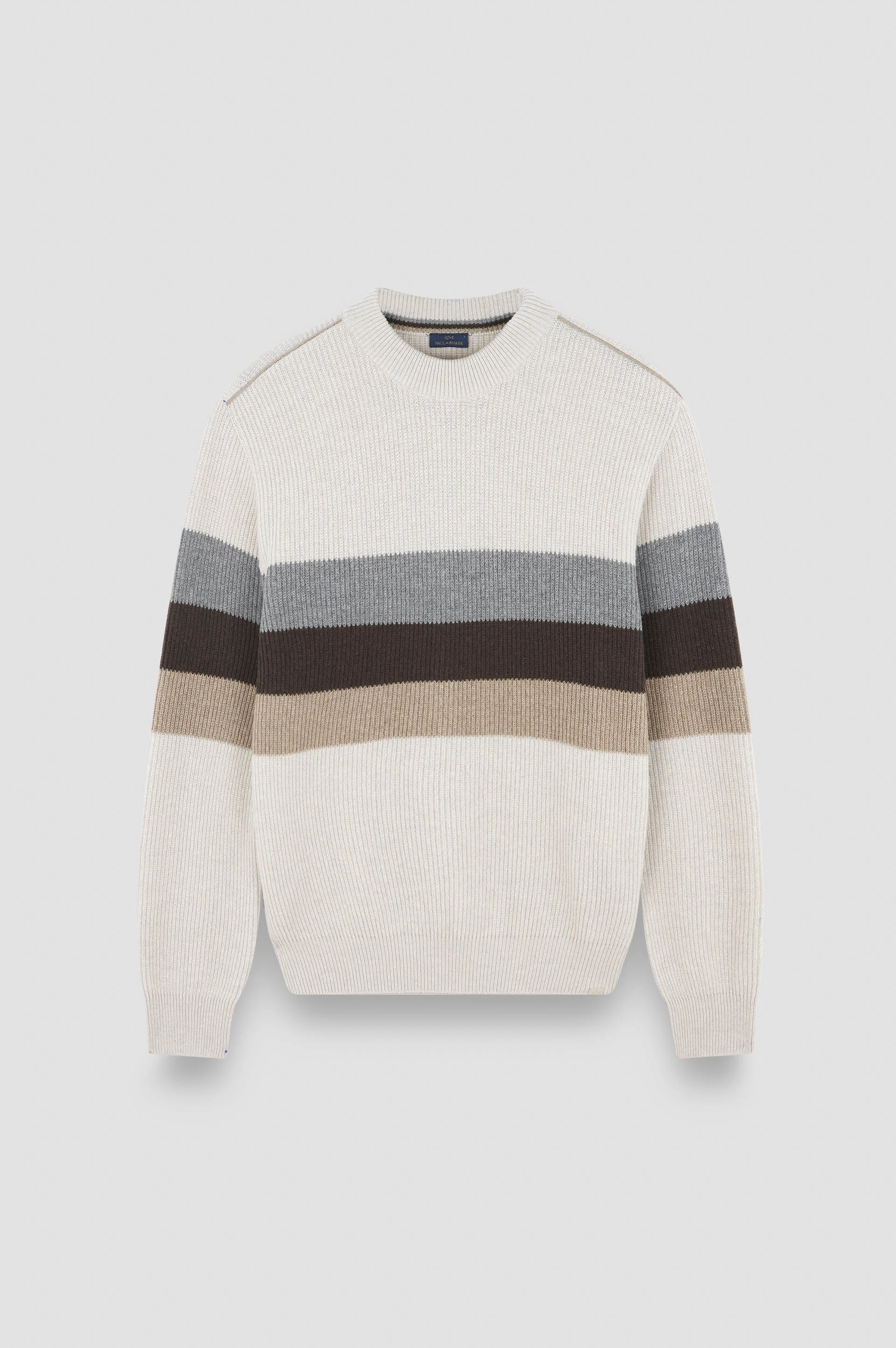 Re-Wool is an innovative and sustainable fabric made from recycled wool, blending craftsmanship with modernity. Its rich texture and hand-embroidered-like surface make it ideal for garments with a refined and conscious design. A responsible choice for collections that stand out for their style and environmental awareness. A statement graphic design, a timeless silhouette and a cosy ribbed texture. This garment is knitted from Re-Wool: a blend of luxuriously cosy regenerated wool, cementing Paul & Shark’s commitment to circular consumption. Styled with ribbed trims and intarsia stripes that bring a dynamic edge to any look. DETAILS Shark label Re-Wool crewneck sweater fineness 8 Ribbed collar, cuffs and flounce English rib knit Long sleeve Regular Fit Product ID: 15311050 COMPOSITION & CARE Composition: Outer: 80% Wool 20% nylon
