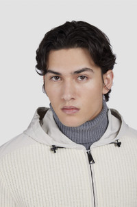 Re-Wool is an innovative and sustainable fabric made from recycled wool, blending craftsmanship with modernity. Its rich texture and hand-embroidered-like surface make it ideal for garments with a refined and conscious design. A responsible choice for collections that stand out for their style and environmental awareness. Perfect for in between seasons, this hybrid garment combines the cosy allure of a cardigan with the protection of a lightweight jacket. A symbol of Paul & Shark’s commitment to circular consumption, it’s knitted from Re-Wool: a blend of luxuriously cosy regenerated fibres. The hood, kangaroo pockets and patches on the sleeves stand out in Re-130 High Density: a super-compact yet soft fabric produced from recycled plastic bottles. DETAILS Shark label Adjustable hood with contrast drawstring Two-way zip closure Hoodie in Re-Wool fineness 5 with pocket, shoulders, and hood in Re-130 High Density Ribbed flounce and cuffs Kangaroo pocket English rib knit Long sleeve Regular Fit Product ID: 15311271 COMPOSITION & CARE Composition: Outer: 80% virgin wool 20% nylon - Hood + Inserts: 70% polyester 30% nylon