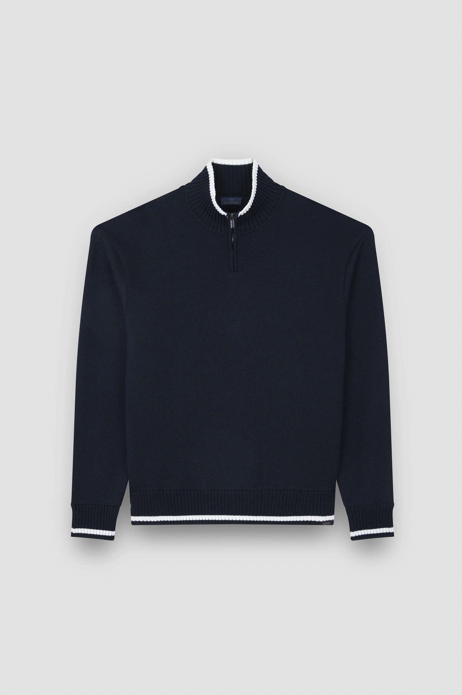 RE-CODED translates the charm of Paul & Shark’s historic archive into a range of timeless, sophisticated looks. Featuring an intarsia design in the colours of the ocean, this jumper rewrites the authentic essence of Paul & Shark to bring a luxurious touch to your everyday rotation. Its cosy silhouette is snug while offering maximum freedom of movement, knitted from supple wool and treated with Soft Cool Touch technology: the yarn is cold-pressed to create a super-compact yet flexible texture that’s resistant to pilling and makes water slide right off the surface. The ribbed trims are detailed with an elegant contrast edge, while the half-zip closure makes it perfect for throwing over collared shirts for effortlessly refined layered looks. DETAILS Shark label Zip closure Soft Cool Touch wool half-zip sweater fineness 8 Ribbed collar, cuffs and flounce Stocking stitch Long sleeve Regular Fit Product ID: 15311145 COMPOSITION & CARE Composition: 100% virgin wool