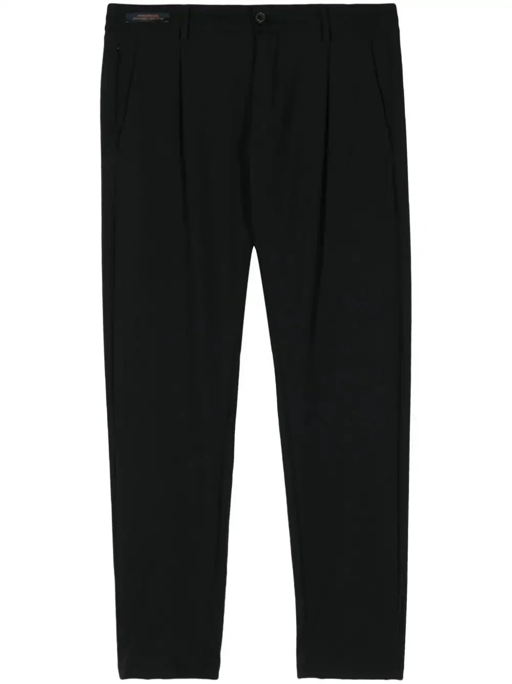 BLACK STRETCH-DESIGN PLEAT DETAILING APPLIQUE LOGO BELT LOOPS CONCEALED FLY AND BUTTON FASTENING STRAIGHT LEG TWO SIDE INSET POCKETS TWO REAR FLAP POCKETS