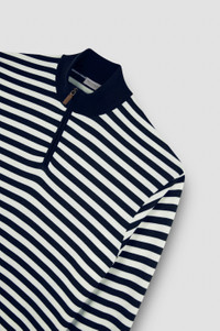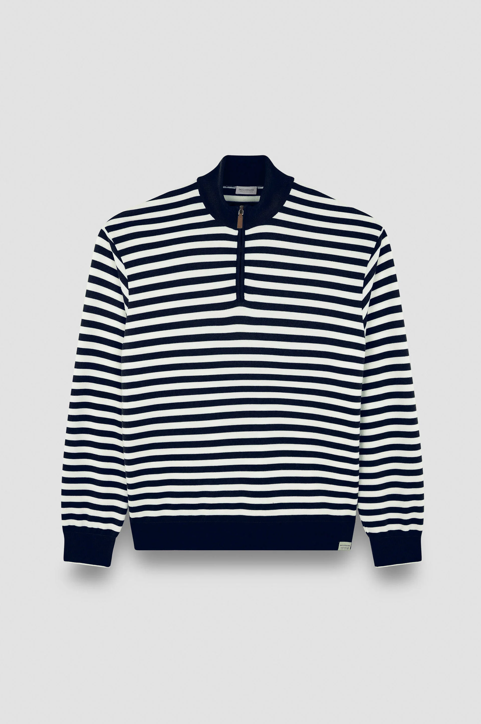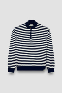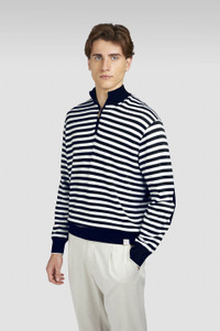 The pieces from the Riviera collection embrace those peaceful moments by the sea in winter when the waves gently crash against the shore, and the fresh air invites you to seek refuge in a minimal-chic style. Inject fresh energy into your wardrobe with this Breton striped jumper. Perfect over a shirt or with a pair of chinos, it boasts a relaxed silhouette with thoughtfully curated details: a half-zip closure, leather pull and tonal patches on the elbows. Knitted from a sophisticated blend of wool and cashmere with a refined stocking stitch for a naturally soft, luxurious feel against the skin. DETAILS Shark label Zip closure Wool and cashmere half-zip sweater fineness 18 Ribbed collar, cuffs and flounce Stocking stitch Long sleeve Regular Fit Product ID: 15311117 COMPOSITION & CARE Composition: Outer: 90% Virgin Wool 10% cashmere