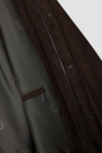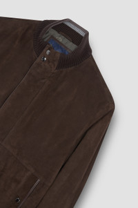 DETAILS Metal Shark Fin Button closure Bomber in suede Aqualeather Ribbed collar, cuffs and flounce Buttoned pockets Internal pocket Regular Fit Product ID: 15312488 COMPOSITION & CARE Composition: Outer: Genuine goat leather – Lining: 51% Polyester, 9% Acetate – Sleeve lining: 100% Polyester – Padding: 100% Polyester