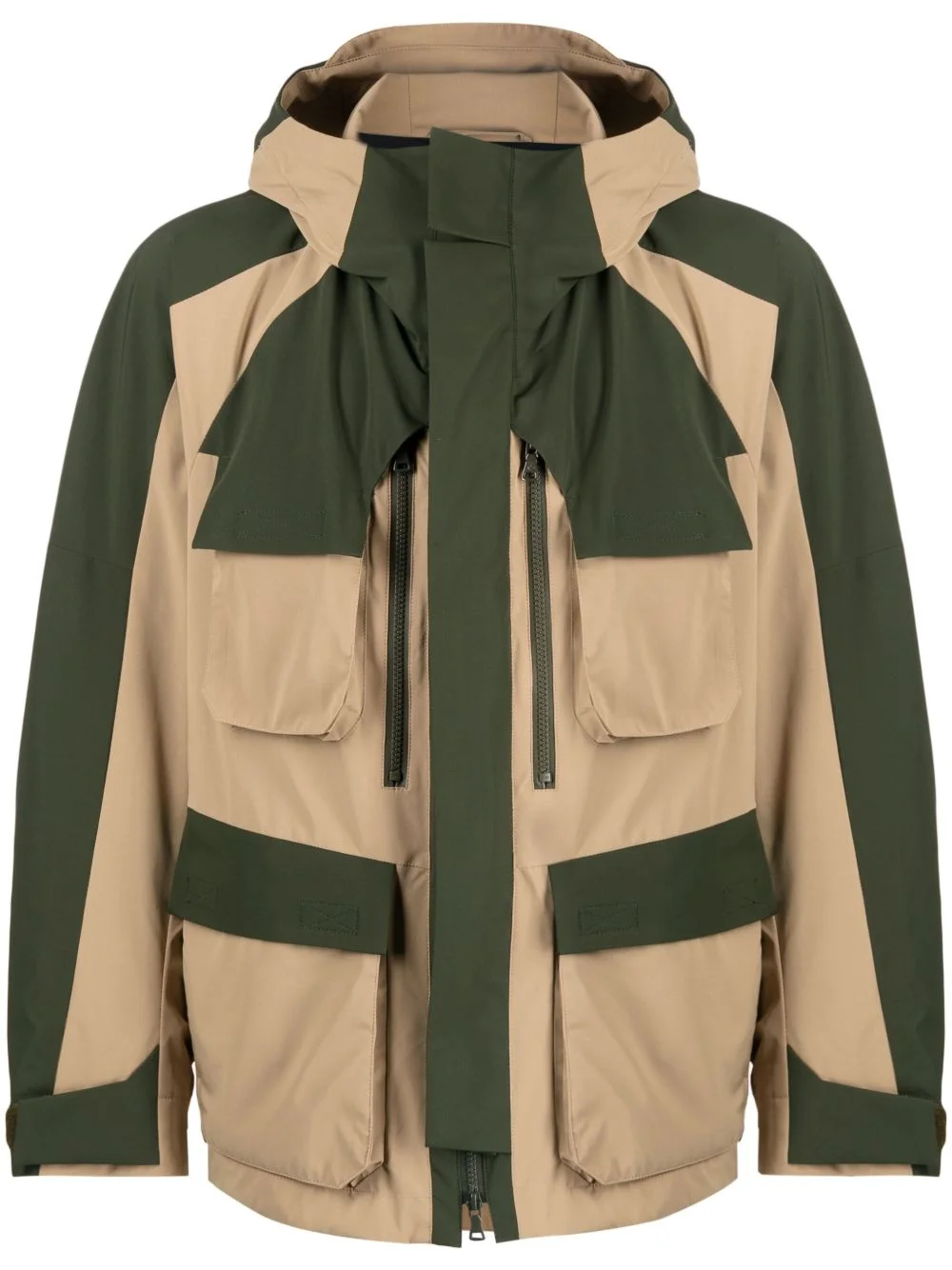 two-tone sport jacket Highlights - Beige/olive green - Stretch-design - Two-tone design - Stand-up collar - Slouchy hood - Concealed front zip fastening - Chest flap pockets - Front flap pockets - Long sleeves - Touch-strap cuffs - Straight hem Made in Italy Composition Polyester 94%, Spandex/Elastane 6% SIZE & FIT Model measurements Height 6 ft 2 in(1.87 m) Bust/Chest 34.25 in(87 cm) Hips 36.22 in(92 cm) Waist 29.52 in(75 cm) FittingInformation Designed to be unstructured, offering a loose fit throughout Made from a midweight stretch fabric, this piece offers elasticity and flexibility when worn This piece fits true to size – take your usual size