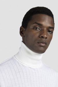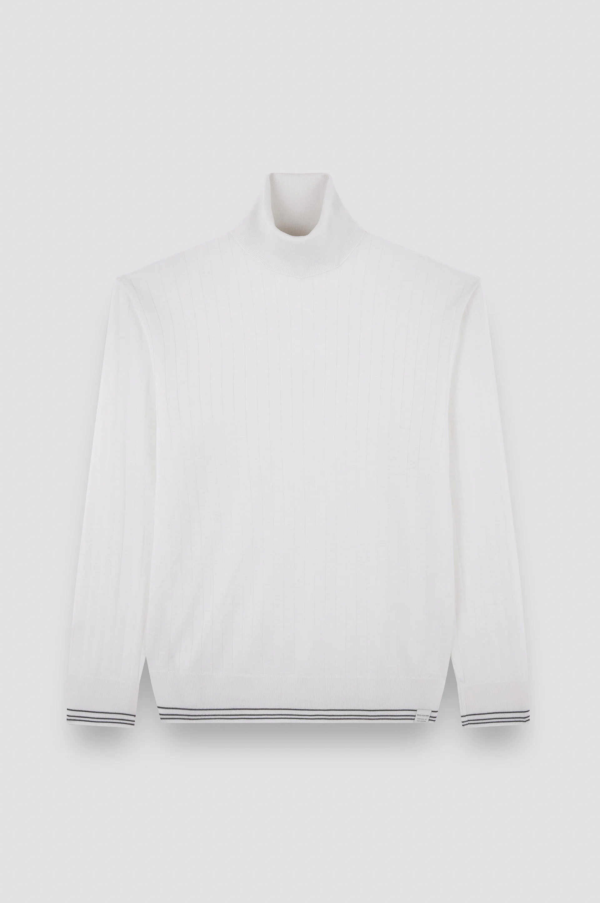 The pieces from the Riviera collection embrace those peaceful moments by the sea in winter when the waves gently crash against the shore, and the fresh air invites you to seek refuge in a minimal-chic style. Minimal lines and exceptional softness bring out the elegant allure of this cosy yet practical jumper, specially designed to fit the bill for every occasion. Crafted from a refined blend of wool and cashmere with a delicate weave that feels soft to the touch, it features a cosy turtle neck for maximum warmth. Our Shark label is stitched onto the sleeve for a signature touch, whilst striped ribbed trims create a snug feel and a well-defined silhouette. DETAILS Shark label Wool and cashmere turtleneck sweater, gauge 18 Ribbed collar, cuffs and flounce Gerippter Pullover Long sleeve Regular Fit Product ID: 15311018 COMPOSITION & CARE Composition: Outer: 90% Virgin Wool 10% cashmere