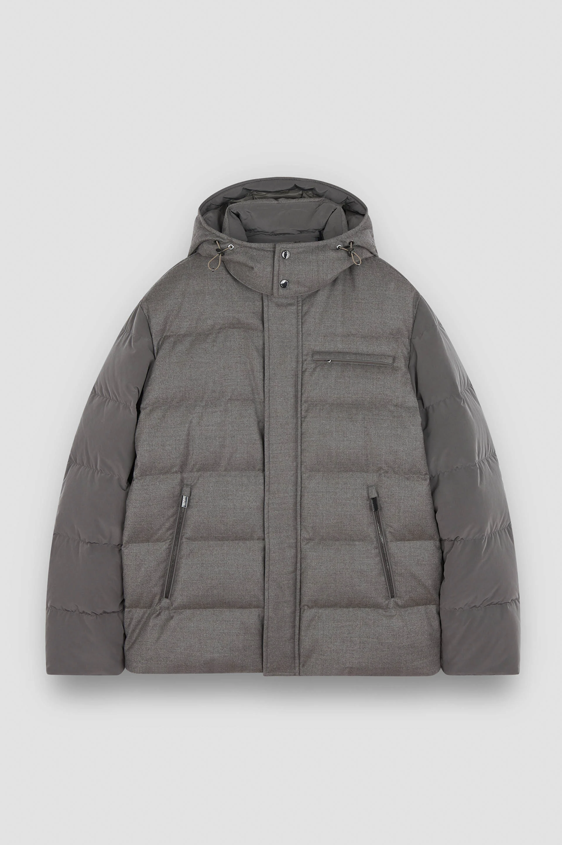 Luxurious materials, refined silhouettes and meticulous attention to detail: the ultimate embodiment of Paul & Shark's effortless elegance. Elevate your everyday wardrobe with the exclusive elegance of this sophisticated garment. This puffer jacket is crafted from a wool-silk blend produced in Italy with Loro Piana's Green Storm System®: a Loro Piana registered trademark that makes the fabric waterproof and wind-resistant, without altering the softness or comfort of the natural fibre. Enhanced with contrast details, a detachable hood and Re-Goose Down padding, boasting a fill power of 650 whilst giving a new life to recycled goose and duck down. Re-Goose Down uses less water and energy than traditional fibres, and is made without the use of harmful chemicals. DETAILS Metal Shark Fin Detachable hood Two-way zip and press stud closure Channel quilting Down jacket in wool and silk Green Storm System® Made in Italy by Loro Piana® Zipped pockets E.M.W. internal phone pocket Regular Fit Product ID: 15312451 COMPOSITION & CARE Composition: Outer: 95% virgin wool, 5% silk - Sleeves + Inserts: 70% polyester, 30% nylon - Lining: 100% polyester - Interlining: 100% polyester
